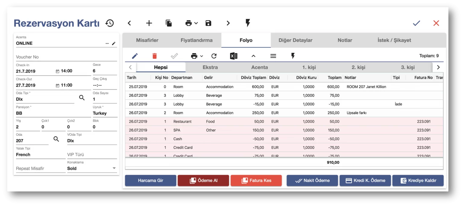 Oda Bazında takip için gerekli olan tüm bilgileri kapsayan bu tabloda oda müsaitlik durumları, oda ve yatak tipi gibi genel bilgilerinin yanısıra arızalı, kirli, blokajlı oda bilgilerine de tek tuşla ulaşılır.